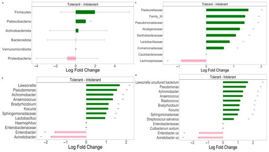 Pairwise comparisons using ANCOM-BC analysis were performed to explore the relative abundance of taxa. The results are characterized by significant differences between intolerant and tolerant neonates’ specimens, as shown in Figure 3.