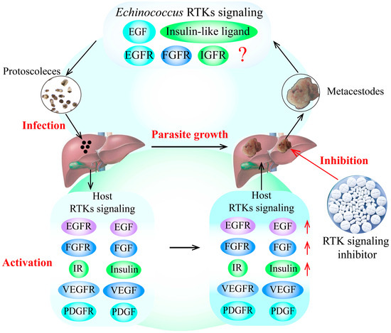 The expression of growth factors or hormone ligands in RTK signaling is significantly increased in the host liver following infection caused by E. granulosus and E. mutilocularis larvae [82,83]. Host growth factors in RTK signaling can promote E. granulosus and E. mutilocularis metacestode growth and development in vitro [31,32,33], indicating that treatment of echinococcosis through the inhibition of RTK signaling is possible.
