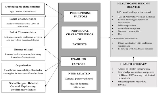 Burapat et al. assessed health-seeking behavior among HIV-infected patients treated for TB in Thailand by using various factors, as follows: socio-demographic characteristics, high TB stigma, low HIV knowledge, usage of sleeping pills, smoking, alcohol intake, hepatitis B surface antigen and hepatitis C virus infection status, whether they had ever been in prison, men who have sex with men (an at-risk group), IV drug abuse, delay in TB diagnosis, and the location where TB/HIV treatment was sought when they first became sick, which is the most influential factor in choosing the medical provider [19]. We discovered that the aforementioned factors were significant for the evaluation of health-seeking behavior. Using the Modified Andersen’s Behavioral Model of Health Services, we can further classify these factors into individual characteristics, need-based factors, enabling factors, and predisposing factors to ensure that no crucial elements are missed and to provide a more comprehensive overview of health-seeking behavior.