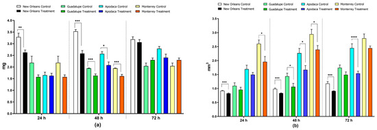 Exposure to spiromesifen also caused a significant reduction in body volume. At 24 h, the Monterrey population exhibited a 25% reduction in body volume (2.6 ± 0.13 mm3 C to 1.96 ± 0.19 mm3 T) (p < 0.05), and the susceptible NO strain showed a 10% reduction (0.92 ± 0.01 mm3 C to 0.83 ± 0.02 mm3 T) (p < 0.0001). At 48 h, significant reductions were observed in all populations: a 15% reduction in the NO strain (0.99 ± 0.03 mm3 C to 0.83 ± 0.01 mm3 T) (p < 0.0001), a 26% reduction in the Apodaca population (2.27 ± 0.17 mm3 C to 1.67 ± 0.15 mm3 T) (p < 0.05), a 26% reduction in the Guadalupe population (1.44 ± 0.11 mm3 C to 1.06 ± 0.12 mm3 T) (p < 0.05), and a 19% reduction in the Monterrey population (2.95 ± 0.17 mm3 C to 2.39 ± 0.14 mm3 T) (p < 0.05). At 72 h, the effect persisted in the susceptible strain, with a 23% reduction in body volume (1.18 ± 0.07 mm3 C to 0.91 ± 0.01 mm3 T) (p < 0.0001), and in the Apodaca population, with a 37% reduction (2.45 ± 0.15 mm3 C to 1.54 ± 0.08 mm3 T) (p < 0.0001) (Figure 1b; Table S2).