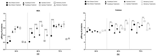 Effects of LC50 spiromesifen exposure on oxidative stress biomarkers. (a) Malondialdehyde (MDA) and (b) catalase (CAT) in fourth-instar Ae. aegypti larvae over time (mean ± SEM; ** p < 0.01, *** p < 0.001, **** p < 0.0001; Mann–Whitney U Test).