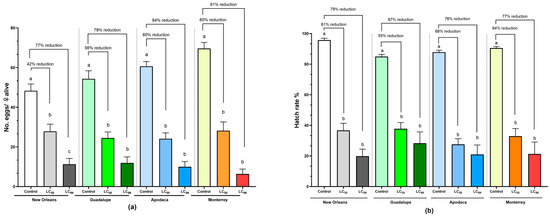When evaluating fecundity inhibition, calculated from females that survived spiromesifen exposure, significant effects were observed at both LC50 and LC99 compared to the control. Exposure to LC50 resulted in a fecundity inhibition of 42% in the susceptible NO strain (p < 0.01), 56% in the Guadalupe population, and 60% in the Apodaca and Monterrey populations (p < 0.0001). On the other hand, exposure to LC99 induced greater fecundity inhibition than LC50, reaching 77% in the susceptible NO strain, and 78%, 84%, and 91% in the Guadalupe, Apodaca, and Monterrey populations, respectively (p < 0.0001) (Table 4, Figure 3a). When reported as the number of females contributing to egg-laying in each group, a significant reduction in female fecundity was observed at LC50 and LC99 compared to their respective controls for all field populations (p < 0.0001). However, for the susceptible NO strain, no difference was found (p > 0.05) (Table 4).