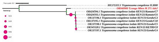 - Okello, I.; Mafie, E.; Nzalawahe, J.; Eastwood, G.; Mboera, L.E.G.; Hakizimana, J.N.; Ogola, K. Trypanosoma congolense Resistant to Trypanocidal Drugs Homidium and Diminazene and Their Molecular Characterization in Lambwe, Kenya. Acta Parasitol. 2023, 68, 130–144. [Google Scholar] [CrossRef]