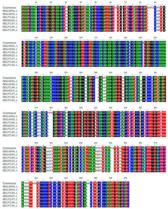 - Thompson, J.D.; Higgins, D.G.; Gibson, T.J. Clustal W: Improving the Sensitivity of Progressive Multiple Sequence Alignment through Sequence Weighting, Position-Specific Gap Penalties and Weight Matrix Choice. Nucleic Acids Res. 1994, 22, 4673–4680. [Google Scholar] [CrossRef]
