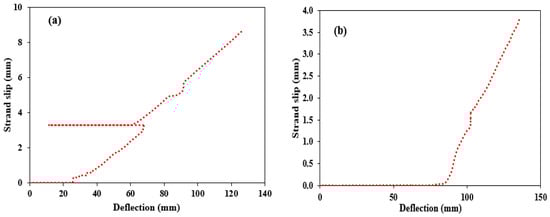 The strand slips at the ends of HCUs were noticeable before loading. These strand slips can be obtained on the prestressing members under a non-serviceability state, and they occurred during the saw-cut of prestressing members, which are referred to as the initial slips. Past studies suggested that high initial strand slips are an indication of low concrete quality and inadequate compaction level, which lowers the flexural and shear strength of HCUs [50,51]. Before loading the HCU specimens, the initial strand slips after the saw-cut from the manufacturer were measured at the ends of HCUs. The final prestressing strand slips were determined at the two ends of individual prestressing strands in the HCU specimens. The initial slip values in most of the strands were in the range of 2 and 3 mm. However, an initial strand slip of 21.0 mm was obtained in one of the strands of the HCU-WB specimen at the south end with a peak final slip of 24.9 mm. The knowledge of prestressing strand slips is typically restricted to free-end slip measurements that are utilized to calculate the transmission length using Guyon’s theory [52]. The results indicated that the prestressing strands with relatively higher initial strand slips may result in larger additional slips during flexural loading. The additional strand slips were computed at the two ends (south end and north end) as specified in Figure 3, displaying the instrumentation of the strands at the south ends. From Figure 7, it can be seen that the prestressing strands in the HCU samples exhibited difference levels of additional slips due to the existing initial slips. The HCU-WB specimens exhibited a maximum average additional slip of 4.49 mm at the south ends for all HCU specimens. Some specimens showed greater additional slips at one end compared to the other end, as shown in Figure 7a. The additional strand slips for all strands at the south end were higher than those of the corresponding north end. In contrast, the additional strand slip values at the south end of the HCU-WTR specimens were higher than those of the north end. Some specimens demonstrated comparatively equal additional strand slips at the two ends in most of the prestressing strands, as indicated in Figure 7b,e. Moreover, prestressing strands in specimen HCU-NT revealed no additional strand slips at the ends of the majority of its strands.