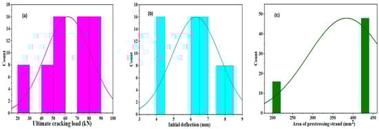 Distribution curves of the experimental dataset. (a) Ultimate clacking load (kN); (b) Initial deflection (mm); (c) Area of prestressing strand (mm2); (d) Width of HCU (m); (e) Final strand slip (mm); (f) Final strand slip (mm).