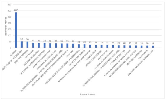 In the bibliographic study, a search was conducted on the Web of Science (WoS) using the keywords “wearable” or “wearables” and “sport” or “sports.” The search query was refined to include articles published between 2015 and 2023, in English, and indexed in either the Social Sciences Citation Index (SSCI) or the Science Citation Index Expanded (SCI-E), with the article type limited to papers. As a result, 2568 papers were found. Query criteria are limited, and only certain keywords and publication dates are used. Therefore, some relevant studies may have been overlooked during the screening process. The journals in which studies on sports and wearables are published are presented in Figure 1. Accordingly, the magazine with the most publications is Sensors with 287 publications. The number of publications per year is presented in Figure 2, showing an increasing trend over the years. Since this paper was submitted before the completion of 2023, the 165 articles from that year are excluded from the graph.