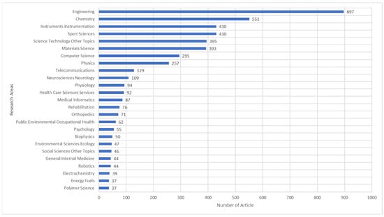 In the context of academic inquiry utilizing the Web of Science (WoS) database, an examination of research areas pertaining to wearables and sports reveals key insights, as illustrated in Figure 3. This figure presents a ranked list of the top twenty research fields along with their corresponding article counts, arranged in descending order. According to Figure 3, the foremost four research areas, in terms of publication frequency, encompass engineering (34.93%), chemistry (21.46%), instrumentation (16.75%), and sport science (16.75%). The realm of research concerning WT predominantly operates within a framework comprising three fundamental dimensions: conceptual design, usage experimentation, and performance analysis. Within the domain of conceptual design, investigations are centered on factors such as sensor utilization, sensor placement, and overarching design considerations. These inquiries are primarily conducted within the domain of engineering studies. In contrast, endeavors related to usage experimentation involve the systematic evaluation of fully developed conceptual designs within meticulously selected and well-defined user cohorts. This category of research assumes an interdisciplinary character, drawing expertise from diverse domains, including physical education, engineering, and health sciences. Performance studies, conversely, are primarily characterized by investigations carried out using wearables that have attained a level of commercial maturity. In the context of these inquiries, the central focus is directed toward the assessment of athlete performance, with coaching emerging as a prominent field where experts in physical education make substantial contributions. Within the purview of these studies, the engineering component primarily finds application in specialized domains, notably computer science and data analysis.