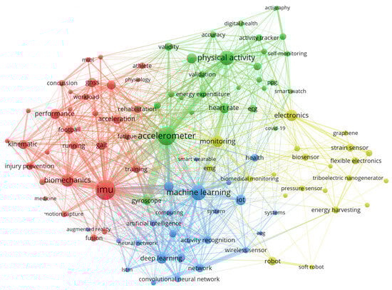 When classifying the countries publishing articles on wearables and sports, the ranking shown in Figure 4 was obtained. The top four countries are Japan (23.48%), the People’s Republic of China (20.00%), the United States (17.25%), and Australia (9.07%). When the keywords “wearable” and “sports” are excluded from the obtained articles’ keywords, and a network is created using the VOSviewer program, the resulting graph is shown in Figure 5. According to this graph, the main keywords are the Inertial Measurement Unit (IMU) and its sub-component accelerometer. Machine learning and physical activity keywords follow. The area highlighted in red primarily focuses on athlete performance. The green cluster is primarily related to athlete health and nutrition. The blue region represents the concentration of machine learning-based studies on wearables and athletes. The yellow color encompasses studies in advanced topics such as electronic, flexible wearables, and robotics.