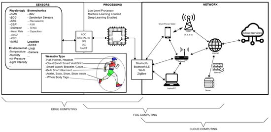 The first layer is the sensor layer, where information obtained from the human body through various means is transmitted as signals to the processor, the second layer of the WT, using analog-to-digital converters (ADC), digital inputs, Inter-Integrated Circuit (I2C), Universal Asynchronous Receiver/Transmitter (UART), Serial Peripheral Interface (SPI), and similar methods. In today’s sports field, WT with sensors or sensor systems provides valuable data by measuring physiological, motion, position, and environmental conditions.