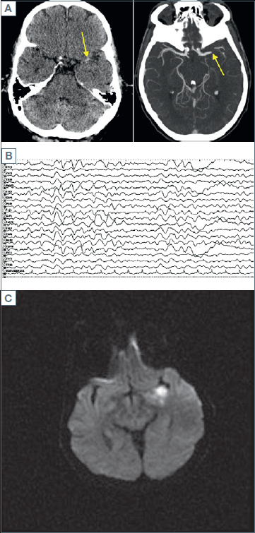 A) CT angiography of the cerebral arteries showed (blue line) occlusion of the left middle cerebral artery; B) Electroencephalogram showed diffuse theta slowing; C) Hyperintensity in left medial temporal lobe on diffusion weighted imaging.