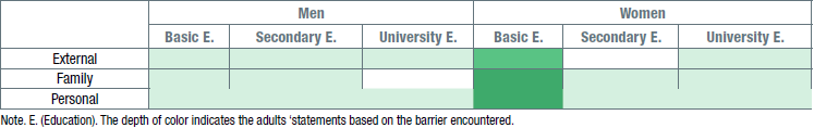 The above table clearly shows that women with a lower level of education are those who present the most barriers in all areas. Moreover, it appears in both the rural contexts and in the neighborhoods at risk of exclusion, since women in Granada-City group have a higher level of education. Therefore, this demonstrates there is a clear tendency towards patriarchal customs in populations with a lower socio-cultural level. Personal and family barriers appear with great prevalence, barriers that are exemplified in the statements of the participants on the macho behavior of their husbands and the problems they encounter when they want to carry out any activity outside of household chores. Likewise, personal barriers also similarly appear to have greater importance, since the childhood of most of today’s older adults has been lived in the patriarchy and they experienced macho customs.