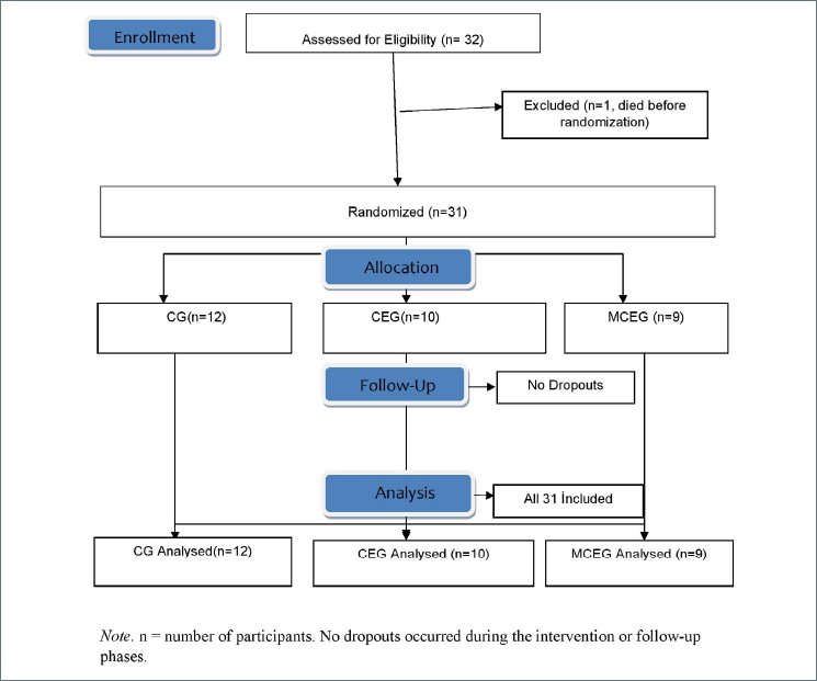 - Lower-extremity strength (30-Second Sit-to-Stand Test): both intervention groups improved, with the MCEG outperforming the CEG (p = 0.001);