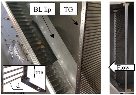 A passive turbulence grid was used to increase the turbulence level in the test section. This grid consists of an array of parallel cylindrical bars with a diameter of 2 mm and a mesh size of 12 mm. The correlation of Roach [40] was applied to determine the axial distance between the central blade and the turbulence grid. Positioned 400 mm upstream of the cascade central blade leading edge, the grid produced a turbulence level of approximately 2.4%. Hot-wire experiments were conducted to validate the correlation and assess turbulence decay upstream of the cascade (see Section 5.1). The position of the turbulence grid relative to the cascade is highlighted in Figure 4.