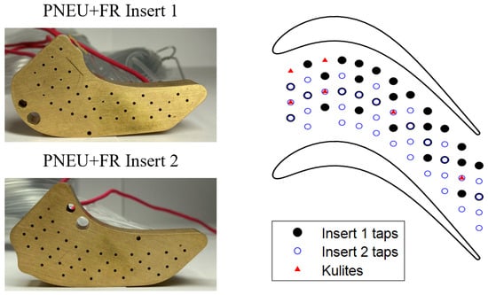 The cascade consists of 23 blades, with five variations of the central blade used during the experimental campaign. A smooth central blade is mounted for probe measurements to ensure that the sensors do not impact the cascade loss. A sliding instrumented blade was designed to measure the pressure and quasi-wall shear stress from the midspan to the endwall. The instrumented blades move across this range, allowing the sensor array to cover the area from endwall to midspan. The set of instrumented blades includes an instrumented blade with 24 pneumatic taps on the suction side, an instrumented blade with seven fast-response Kulite LQ062–5 psi on the suction side, an instrumented blade with 17 pneumatic taps and one Kulite LQ062–5 psi on the pressure side, and an instrumented blade with 32 hot-film (HF) sensors on the suction side and 21 on the pressure side.