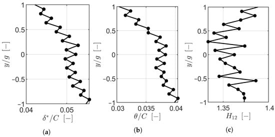 The corresponding nominal blade loading obtained from a fully turbulent Reynolds-averaged Navier–Stokes (RANS) computation is shown in Figure 3b. RANS computations have been performed with the commercially available Cadence Fine™/Turbo 16.1. A slice with 0.80 mm of thickness throughout the axial coordinate was used (axial velocity density ratio of unity). The flow domain is discretized by a single cell in the spanwise direction. Periodicity is imposed over the lateral boundaries. The inlet of the flow domain has been extended 0.75 upstream of the blade leading edge. The outlet of the flow domain has been extended one axial chord downstream of the trailing edge. Stagnation quantities are imposed at the inlet and along the flow incidence, while mean static quantities are imposed at the outlet. The SST model of Menter [35] was used for turbulence closure. Details of the numerical setup and sensitivity to the mesh along with the incidence and turbulent parameters can be found in [36].