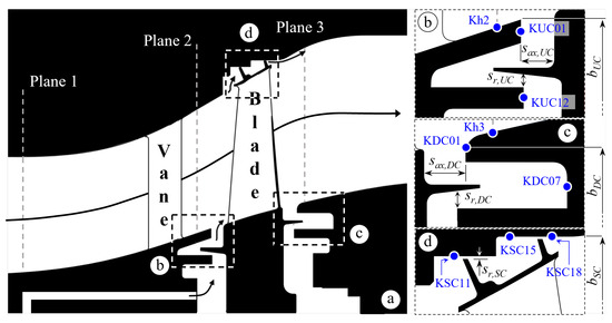 In the upstream cavity, the group of sensors Kh2 is located on the end-wall profile (hub, Plane 2), while groups KUC01 and KUC12 indicate the transducers at the upper and lower lip of the rim seal. In the downstream cavity, the group of sensors Kh3 is located on the end-wall profile (hub, Plane 3), while the KDC01 and KDC07 groups indicate the transducers in the upper lip and in the buffer cavity of the rim seal. KSC11 and KSC18 indicate the group of sensors located upstream and downstream of the shroud cavity sealing region, which is instrumented with sensors KSC15. The exact locations and number of sensors in each group are detailed in Appendix A in Table A1, Table A2, Table A3.