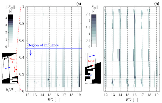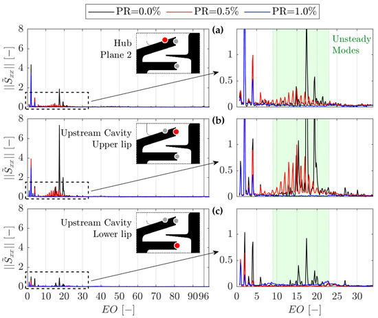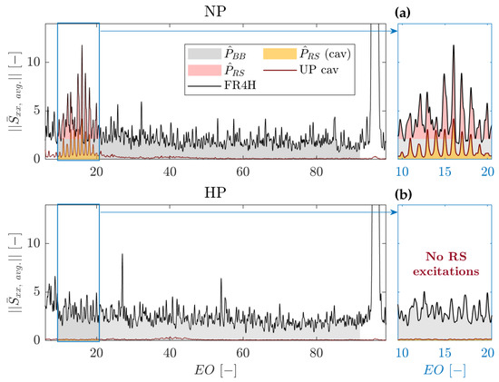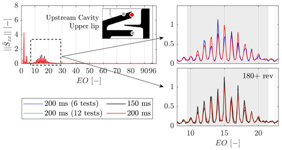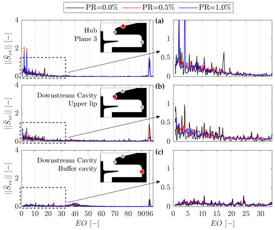 Figure 8 shows the averaged PSD distributions measured at the three radial locations. Different colors are used to distinguish the spectra at ZP (black), NP (red), and HP (blue) conditions. Each distribution is normalized, taking as a reference the peak detected at 15 engine orders (EO) in the spectrum of the upper lip sensor for the NP conditions.