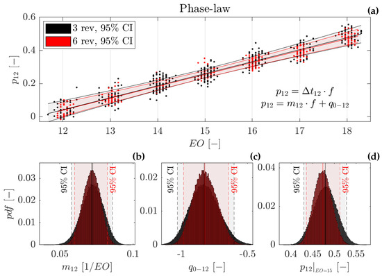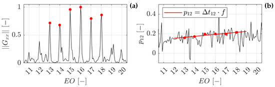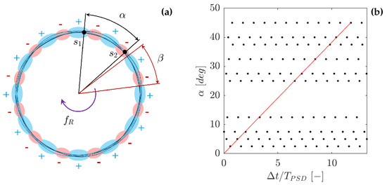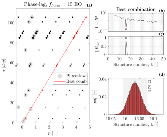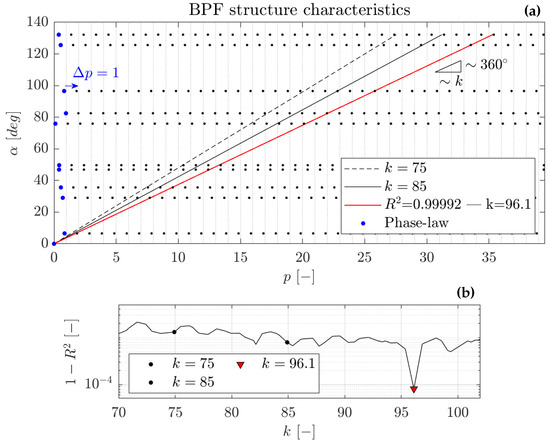 To minimize the spectral leakage, a Hanning window is applied to the signal to be cross-correlated. Zero-padding is employed to set the frequency resolution to approximately 5 Hz. The CPSD distributions are computed using Welch’s method via the MATLAB function cpsd.m. Figure 6a shows the populated phase lag plot. The optimum linear regression is searched by computing for all possible phase lag combinations by identifying which minimizes its value (i.e., the maximum R-square). Each regression differs only in slope, which is related to a specific number of lobes, k, by , and to by . Therefore, it is possible to directly relate the number of lobes to the equivalent as in Figure 6b and then search for . In this application, the minimum of is detected at , separated by one order of magnitude from the other regressions, and only by an error of 0.1% from the nominal value , thus validating the methodology.