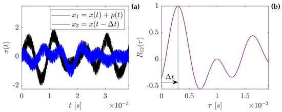 while is white noise set at 50% of the amplitude. Figure 4a shows a plot of the two signals in the time domain, while Figure 4b displays their cross-correlation. The cross-correlation is computed employing the MATLAB function xcorr.m. The figure highlights the position of the first peak in correspondence with the time delay imposed over the “common” component of the signal , showing the effectiveness of the technique even in case of spurious contributions such as , fluctuating at comparable, but distinct, frequencies. Furthermore, since is defined to occupy multiple locations in the frequency spectrum, the cross-correlation plot is not regular after the first peak, showing different spacings between the following peaks, all of a lower magnitude.