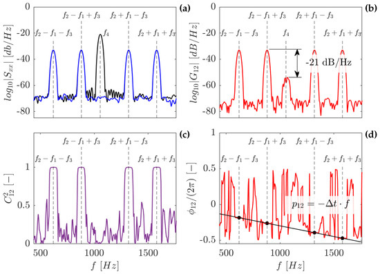 The phase in Figure 5d shows that Equation (3) is verified in correspondence with the four modulus peaks, which are the zones of the spectra where the signal is well defined. Outside these locations, similarly to the coherence distribution, the module of the CPSD becomes too small, and the effects of numerical error, noise, and frequency resolution become predominant.