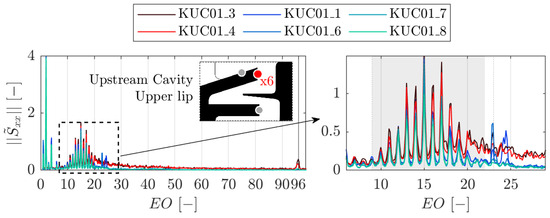 The analysis of the average PSD profiles in the upstream cavity indicates a high degree of uniformity among different sensors at the same radius. Figure 7 illustrates the average distributions derived from the six sensors placed on the upper lip. All major unsteady features are identified by each sensor. The shape and location of these features are consistent across all profiles, with only minor discrepancies in amplitude. The area highlighted in grey is the most affected, with deviations ranging from 10 to 15%. This variation corresponds to pressure fluctuations that are below the uncertainty of the pressure measures, and aligns with the results of the PSD convergence analysis. The exceptions are the sensors KUC01_3 and KUC01_4, which are mounted on the same insert and show an increase in modulus exceeding 20%. This increase is consistent and more pronounced at higher frequencies, suggesting a higher sensitivity to noise.