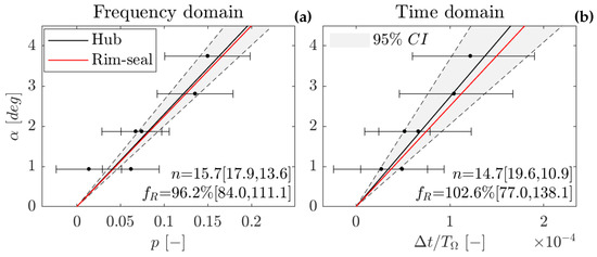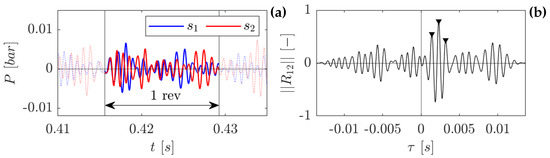 The standard cross-correlation technique involves the computation of the time delay associated with the CM structures traveling between two sensors. The delay is determined through cross-correlation of the pressure signals, which are pass-band-filtered to isolate the CMs. Knowing the relative distance between the two sensors , the frequency of the CM fluctuation observed by the pressure transducers , and assuming that the sensors’ distance is smaller than the wavelength of the rotating structures (), the velocity and number of lobes can be computed from and , respectively. To avoid inferring a priori the minimum distance between two consecutive lobes, Beard et al. [31] proposed to iterate the time delay computation for various sensor combinations and across multiple time windows (typically of the duration of one rotor revolution). Collecting all the data into plots makes it possible to identify n and from the linear regression that better fits the measured time lags.