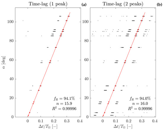 Figure 3b provides an example of an ideal time lag plot where the time delay is normalized through the frequency . The optimal regression, represented by the red line, is defined by the linear fit that connects the highest number of “time delay points”.