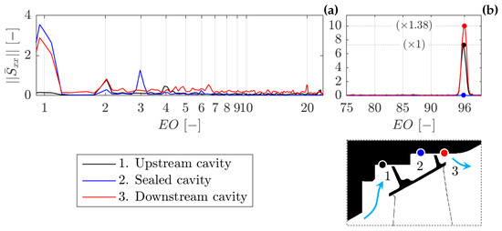 Similar unsteady features were found by Perini et al. [28] and Kluge et al. [29], who investigated the unsteady flow developed in the shroud cavity of an LPT. Both studies attributed the source of the unsteadiness to shear-layer interactions. Perini et al. demonstrated that the detected lobes’ length scale is compatible with Kelvin–Helmholtz instabilities.