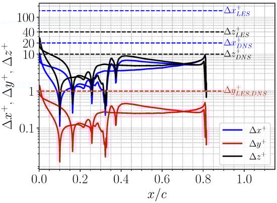 The final mesh resolution for polynomial order 5 is reported in Figure 1. Here, the clean inflow case wall-shear stresses were used as these were found to be larger than those of the turbulent inflow, and thus, they would be more stringent in terms of mesh sizing. The -plane linear grid is shown in Figure 2. In terms of true chord length, the largest high-order elements in the mesh had a size of . Concerning the spanwise direction, an extrusion () of of the true chord was carried out requiring 160 Fourier modes () to reach DNS resolution.