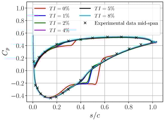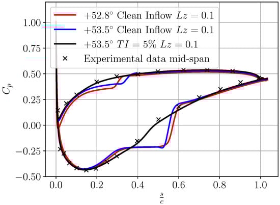 The time-averaged Fourier mean-mode flow field is shown in Figure 3. A large separation bubble is present on the suction side; this is consistent with the experimental data of [15]. The authors claimed it would then disappear by either increasing the inflow angle of incidence or by turbulence injection. However, the experiments did not show any bubble on the pressure side of the blade. Nonetheless, it is not the first time that simultaneous separation bubbles have been shown on either side of the blade; ref. [4] reported their presence on a NACA0065 at incidence. The pressure loading is shown in Figure 4. The first point of note concerns the experimental data point (black crosses) discrepancies with the clean inflow CFD results; the latter shows a large difference in size between the suction and pressure side bubbles. The reason behind the second angle of incidence (), other than the nominal one (), relates to the load matching; when injecting turbulence, unless the angle is slightly varied, it will not align with the experimental distribution. From this point onwards, only results at the corrected angle of will be presented.
