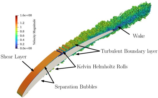 The instantaneous Q-criterion contours coloured by the velocity magnitude are shown in Figure 5. On both sides of the blade, Kelvin–Helmholtz (KH) rolls are formed with transition to turbulence thereafter. The separation occurs at different locations on the pressure and suction side of the blade as follows: and , respectively. Referring to the pressure coefficient in Figure 4, it is obvious that unlike the pressure side, the suction side undergoes a region of favourable pressure gradient upstream.