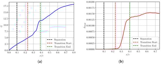 where is the time-averaged velocity at the boundary layer limit (), is the momentum thickness, and R is the radius of curvature of the surface (in this particular work, the boundary layer height and reference velocity are computed using the methodology of [35]; a brief description is provided in Appendix B). When , this type of instability can be triggered, while the vortices may be seen when [4]. A plot of this quantity is reported in Figure 6a; this clearly indicates that the disturbance could be present. Considering the Blackwelder number () defined as follows [36]: