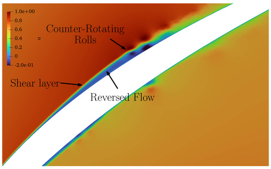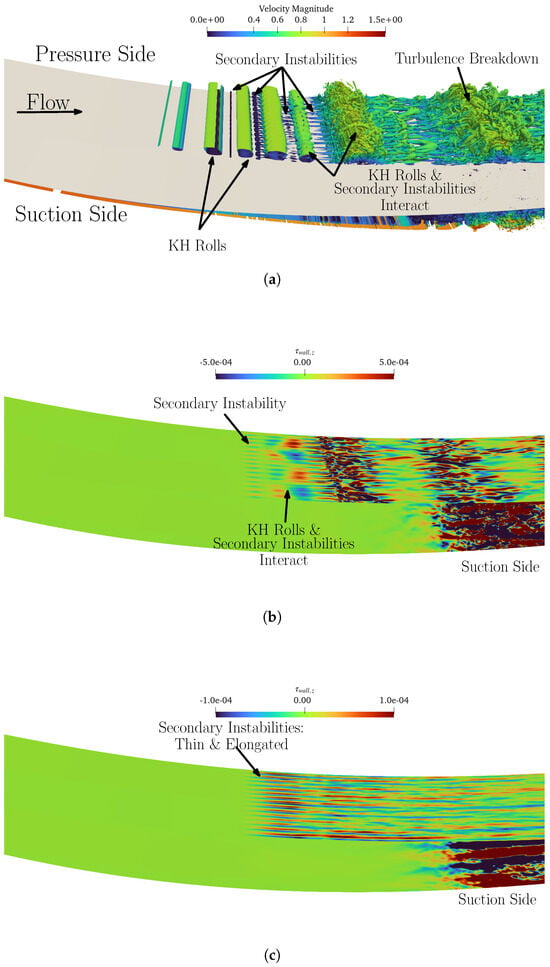 where and are two components of the Reynolds stresses, it is possible to determine an accurate transition start and end (Figure 6b). The estimated transition range contains the values whereby the Görtler vortices may be seen, hinting at the fact that they may be affecting the transition mechanism. Despite repeated attempts, these could not be seen in any of the Q-criterion contours. Figure 7a shows the blade pressure side, with the flow direction clearly indicated. The structures appearing are an interleaving of KH rolls and what appear to be secondary instabilities that assume a narrow and elongated shape, ultimately wrapping around the spanwise rolls. Figure 7b,c display the instantaneous and time-averaged wall-shear stresses, respectively. The transition mechanism is therefore a joint effort of the two; the secondary instability forms and is then picked up by the KH rolls.