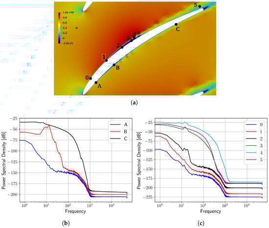 Power spectral density of the sampling points within the pressure and suction side boundary layers. (a) Sampling point location; numbers are points on the suction side and letters on the pressure side. (b) Pressure side. (c) Suction side.
