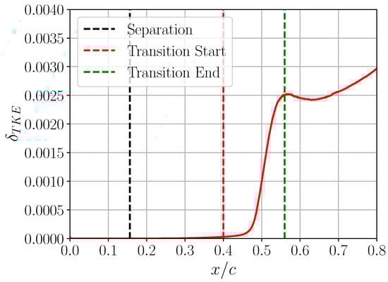 The extrusion length of corresponds to double the maximum boundary layer height. When comparing the autocorrelations with those of the wider domain, a low value was generally found; nevertheless, a slightly higher trend for one of the values was seen. To be able to accurately assess whether the turbulent transition mechanism was affected by the change in spanwise length, the difference between the separation and transition locations of the and were computed on both the pressure and suction sides. The maximum discrepancy was estimated to be , less than half a (suction side re-attachment), with all the others being less than . Therefore, the true chord extrusion was found to be sufficient to accurately assess the behaviour of both the pressure and suction side boundary layer.