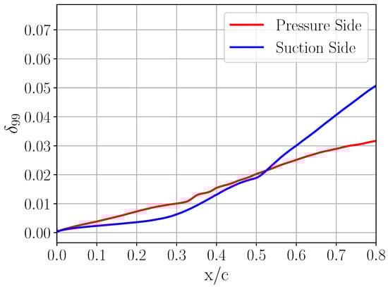 An automated method developed by [35] was used to determine the boundary layer height and reference velocity ( and , respectively). It is valid for incompressible solutions and involves taking normal wall samples and identifying the point at which the total pressure asymptotically converges. The local free-stream velocity is then recovered and the boundary layer height is defined as the location where the velocity reaches of the previously determined free-stream value. This is then repeated for a series of normal wall sampling lines covering the entire blade surface.
