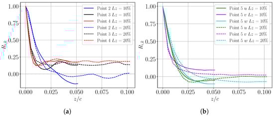 Spanwise autocorrelation for the clean inflow case with and . (a) Points 2–4. (b) Point 5.
