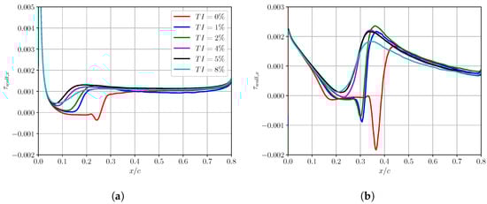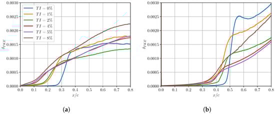 The suction side shows a similar sort of behaviour to its pressure counterpart; the lowest turbulence intensities ( and ) are not able to completely change the transition mechanism that continues to include a fully separated region with KH rolls. Nonetheless, separation is pushed further downstream while transition is pulled upstream, shrinking the recirculation as disturbances are injected (Figure 14b). The gradual change in the mechanism is better visualised in Figure 15c; shifting from through to demonstrates how the spanwise rolls are pulled upstream and start to be affected by the increasingly stronger turbulence levels reaching the blade. Even at , bypass has not been achieved; the time-averaged mean-mode axial wall-shear stress in Figure 14b shows a tiny negative spot, indicating that more localised unsteady separation is taking place. Once a level of and disturbances is reached, the flow does not separate. The Blackwelder parameter in Figure 16b shows an interesting trend as follows: as the inflow disturbances grow from to , the decreases, indicating that the Reynolds stresses are weaker and/or the boundary layer height is lower. When , however, the parameter starts to grow once again. To better quantify whether this aspect can have an effect on losses related to the boundary layer status, the suction side momentum thickness can be plotted. This is defined as follows (noting the incompressible status of the flow field):