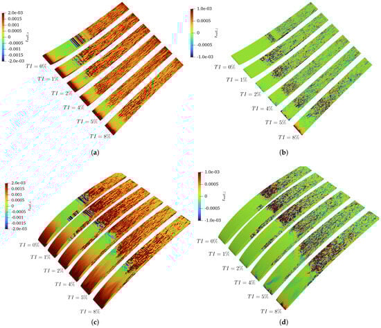 Comparison of instantaneous wall-shear stresses for through to . (a) Axial—Pressure side. (b) Spanwise—Pressure side. (c) Axial—Suction side. (d) Spanwise—Suction side.