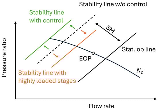 Schematic shift of the stability line due to highly loaded stages and control mechanisms.
