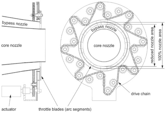 To evaluate the effectiveness of air injection, flow instabilities must be induced in the LPC. To conduct that, the above-mentioned nozzle configuration with separate bypass and core outlets is advantageous, because it allows the low-pressure compressor to be throttled independently of the HPC. To throttle the LPC, a bypass throttle device was installed on the Larzac 04 C5, shown in Figure 3. It consists of multiple throttle sections that reduce the nozzle exit area from 100% to a minimum of 10%. This setup allows exceeding the stability limit in a controlled way and thus to measure the characteristics of the Larzac 04 C5 LPC in a reproducible way.