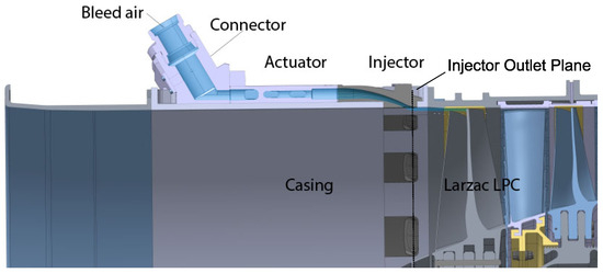 Based on the knowledge gained on injection systems at IJP through former studies in this field of research, the power of the injection should be maximized in the new setup to gain the highest possible and most efficient SMI [17]. Separate (discrete) injection positions can generate more power of the injection with the available mass flow. To control the mass flow to be injected, the actuators described in Section 3.1 are used in a non-invasive design. In order to install these actuators directly upstream of the rotor of the first stage of the Larzac 04 C5, a new casing and injector were designed and manufactured. A sectional view shows the arrangement of the AFC system and the LPC of the Larzac 04 C5, see Figure 4. This injection system uses the Coandă-effect to align the injected flow with the casing wall. By using the Coandă-radius, the streamlines follow the wall contour and the airflow reaches the blade tip region at high velocity. The Coandă-effect inside injection systems is already used by Strazisar et al. [25] and Kern et al. [21].