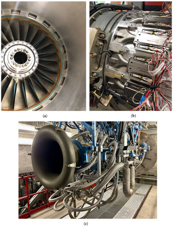 Experimental test setup on the Larzac 04 C5 engine. (a) AFC inner inlet view w/o spinner [30]. (b) Actuators and injectors installed into the casing. (c) Final test setup installed into the test bed [31].