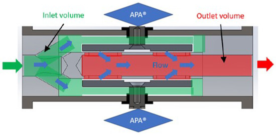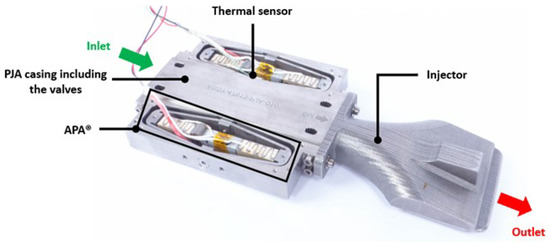 The final actuator consists of a piezoelectric active system that functions as a PWM (Pulse Width Modulation) valve, including the piezoelectric actuators, called APA® and a passive system, including the injector used to optimize the flow. In detail, the active system is composed of two customized APA400MML® working in parallel (Figure 6). The role of these piezoelectric actuators is to open/close two valves, see Figure 7 in gray. The APA400MMLs are positioned in parallel to the flow and expand under electrical voltage. This force expands the frame of the APA400MML and thus opens up the flow path within the actuator. The maximal gap inside the valve is 300 µm on both sides and can be controlled up to 200 Hz (square on/off modulation). The APA400MML® is customized because the interfaces were modified and it is thermally compensated to limit the impact of the thermal evolution on the performances. Indeed, the work of optimization to limit the effects of the thermal expansion allowed to reduce the Coefficient of Thermal Expansion (CTE) of the APA® from 145 ppm/K to 38 ppm/K. This reduction is limiting the impact of the temperature on the leakage when the valves are closed.
