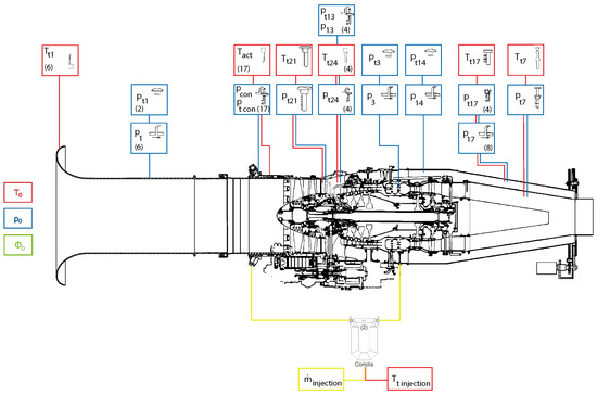 Besides the regular performance and operation surveillance instrumentation such as spool speed, fuel flow, thrust, etc., the Larzac 04 test vehicle comprises extensive instrumentation at the LPC, which is shown in Figure 9. The red markers indicate the positions of temperature probes, the blue markers represent pressure measuring probes and the yellow markers show the mass flow measurement points. The number in brackets indicates the number of equivalent positions in the test vehicle. To adjust the variables to ISA standard conditions, ambient temperature, ambient pressure and humidity were recorded and used to calculate the corrected values. The bleed air mass flow rate and temperature are determined using two Coriolis flow meters located just after the bleed air leaves the HPC. In addition to the previously mentioned instrumentation, the Larzac 04 C5 was equipped with instrumented stator vanes featuring pressure probes. These probes provided detailed information on the radial flow differences downstream of the rotors. Additionally, a high-frequency measurement system with piezoelectric pressure transducers from Kulite was used. These transducers are described in detail by Kern et al. [23] and are documented in the ACONIT Report [32].