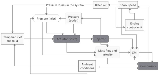 Unlike in a controlled test rig, where parameters can be adjusted individually, using bleed air does not allow the independent variation of parameters like pressure and mass flow. By using bleed air, many different factors have an influence on the change in the SMI. This is illustrated by Figure 10. The hardware components are highlighted in gray, and the flow components in white. For example, the spool speed has an influence on the bleed air mass flow. This, in turn, has an influence on the pressure losses in the system. This leads to speed-dependent temperatures and pressure upstream of the actuator. Depending on the temperature, the gap width of the actuator changes, which consecutively changes the mass flow. The pressure also has an influence on the air mass flow to be passed through. Depending on the mass flow, the downstream injector creates a back pressure for the actuator, which changes the pressure difference in the actuator, and therefore, the mass flow. All of this has an influence on the SMI and the compressor, which in turn, has an influence on the spool speed. Subsequently, the spool speed, in turn, has an influence on the engine control unit, as this regulates the fuel mass flow depending on the speed and thus changes the speed.