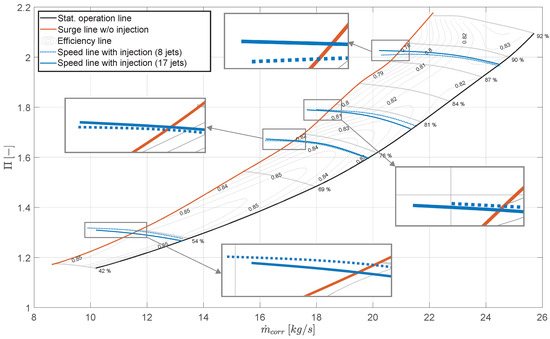 First, the SMI at different spool speeds will be considered and later the comparison at the same speed will be conducted. Therefore, the effects of the injection with regard to the SMI can be demonstrated well in the Larzac 04 C5 fan map, see Figure 11. In this figure, the stability line without injection is printed in orange, while the speed lines with injection are shown in blue. The results with eight jets are printed in a dashed line and the results with 17 jets are printed in a solid line. It is clearly seen that many stable EOPs are left of the stability line without injection. Taking the definition of SMI (see Equation (3)), in all cases with injection, an improvement is observed. The highest SMI, no matter with 8 or 17 jets, occurs at an operating point of , but as the LPC spool speed increases, the SMI decreases. These findings are consistent with previous studies, which have also reported higher SMIs at mid-speed levels and lower SMIs at high speeds [8,20].