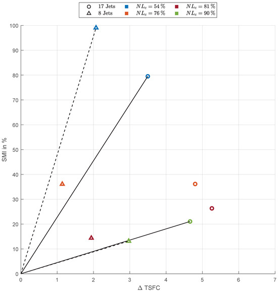 The diagram reveals that the eight-jet configuration demonstrates a steeper gradient, indicating a more favorable cost-to-benefit ratio at these spool speeds. However, as spool speed increases, the gradients for both configurations converge. This suggests that the relative advantage of the eight-jet configuration diminishes not only in terms of SMI but also with regard to the cost-to-benefit ratio. At , the gradients for both configurations become nearly identical.