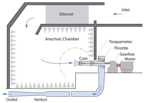 Figure 1). Air is sucked in from the roof and flows through a set of silencers and into the anechoic chamber containing the machine. After passing the core, where the fan stage is situated, the compressed air passes an axisymmetric cone throttle that enables accurate control of the mass flow. In order to measure the mass flow, a Venturi nozzle is installed after a 25 m long circular tube section. Finally, the air passes through a diffuser and another set of silencers and then is extracted to the outside environment.